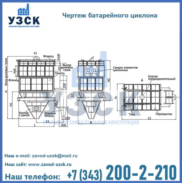 Каждая секция батарейного циклона оборудована бункером для сбора улавливаемых частиц. Отключение той или иной секцию батарейного циклона осуществляется с помощью перекидного шибера при нагрузке на котел в пониженном режиме. Верхняя панель выхлопной камеры оборудуется предохранительным клапаном и лазом. Каркас «батарейного золоуловителя» выполняется из прокатных стальных листов. Обшивка кожуха с наружной стороны укрепляется теплоизоляцией.