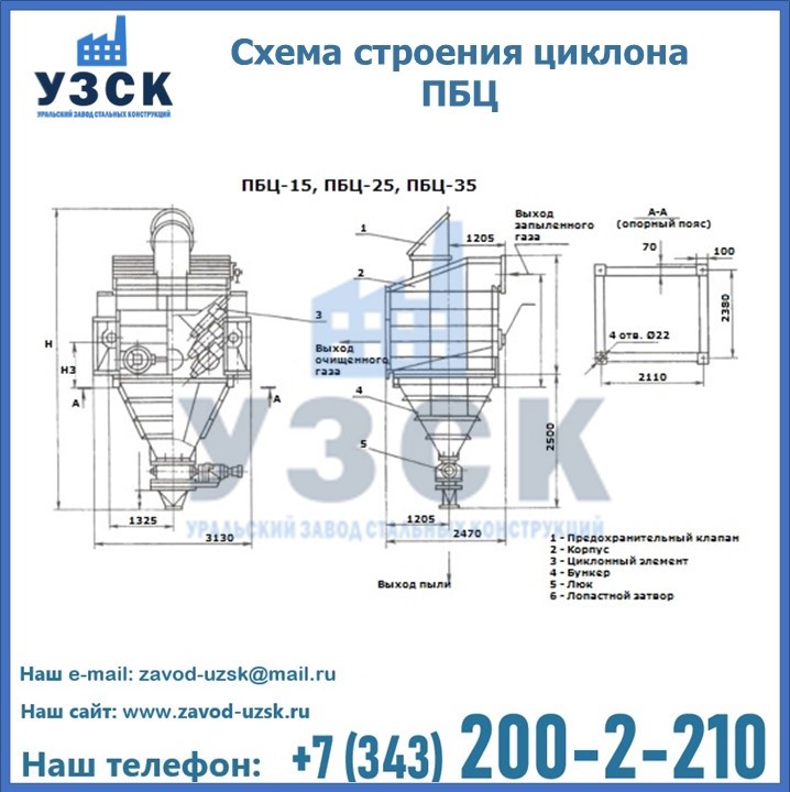 Завод «УЗСК» в Санкт-Петербурге предлагает приобрести циклоны ПБЦ и прочие устройства, полностью укомплектованные и готовые к эксплуатации. Мы гарантируем соответствие оборудования всем требованиям ГОСТ и ТУ, износостойкость и высокую производительность предлагаемого оборудования. Уральский Завод Стальных Конструкций изготавливает и продает надежное, эффективное и производительное оборудование, имеющее длительную гарантию и большой эксплуатационный ресурс. Если требуется изготовить циклон нестандартных размеров, то такой вариант выполнения заказа тоже предусмотрен, так как предприятие имеет собственные производственные площади и надежных поставщиков. На все поставляемое или производимое оборудование имеются чертежи и прочая техническая документация. Заказать и купить циклоны или прочее оборудование высокого качества и по доступной цене можно через наш сайт или по указанному в разделе «Контакты» телефону.